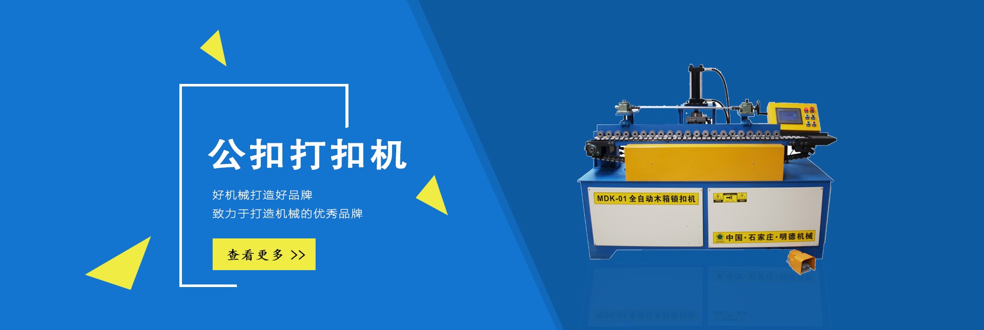 石家莊明德包裝機械有限公司是國內專業生產木全自動木箱鋼帶機、半自動公母扣木箱打扣機、全自動雙排孔定長切斷機、美式托盤打釘機械、托盤刨槽機、倒角機、木包裝箱、木托盤的生產廠家。